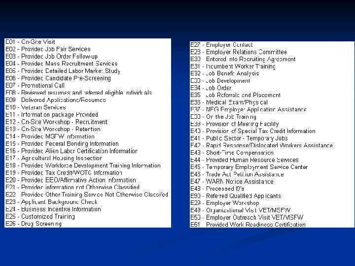 E 44 Provided Human Resource Services One-stop center staff provided some type of personnel service to an employer. n Type of service should be stated in the comments. n
