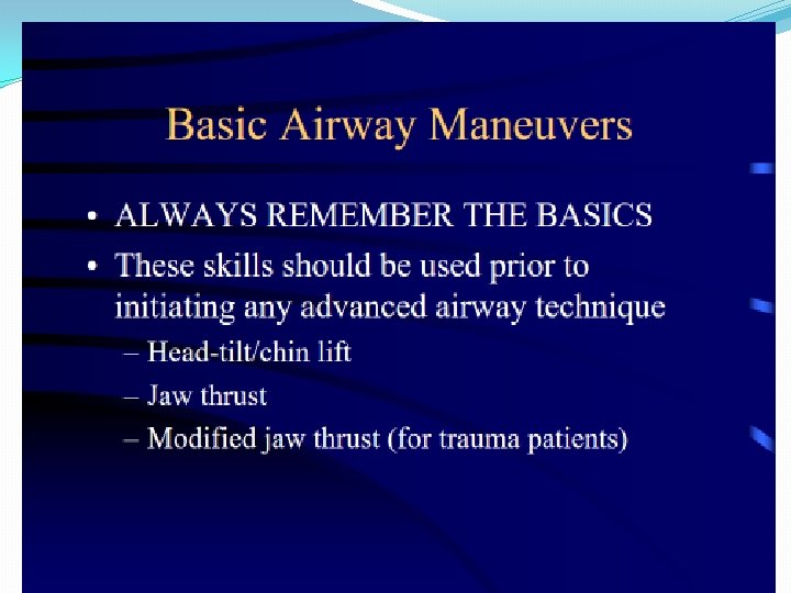 Airway Adjuncts �The oropharyngeal (OP) and nasopharyngeal (NP) airways are used to relieve an obstructed airway after the initial jaw thrust maneuver has shown its effectiveness. �The adult OP airway comes in small, medium, and large sizes �Proper sizing is made by holding the airway along the cheek. It should stretch from the tip of the ear to the corner of the mouth