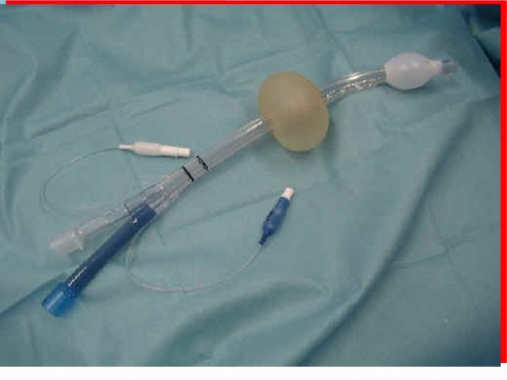 Combitube There are two balloons, each with an inflation port. The distal balloon is inflated with 15 cc of air and seals the esophagus. The proximal balloon is inflated with 60 cc of air and seals the oropharynx. Lumen 1 is closed at the tip but has holes between the balloons that allow air to enter the trachea. Lumen 2 is open at the tip but not between the balloons. After insertion, the BVM is attached to lumen 1 and the patient is ventilated