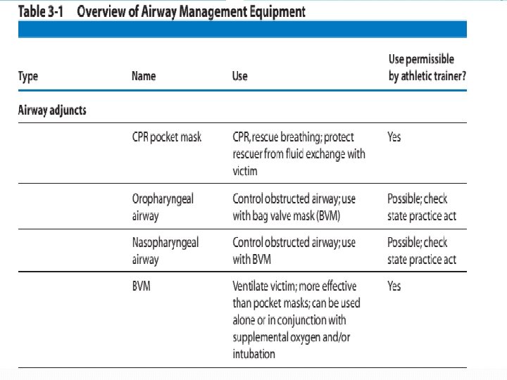 Large sports medicine staffs should consider having at least one person available who has the training and legal status to perform advanced airway techniques. Other devices used to secure an airway require less training and frequency of use to maintain proficiency. State laws may or may not allow athletic trainers to use these devices.