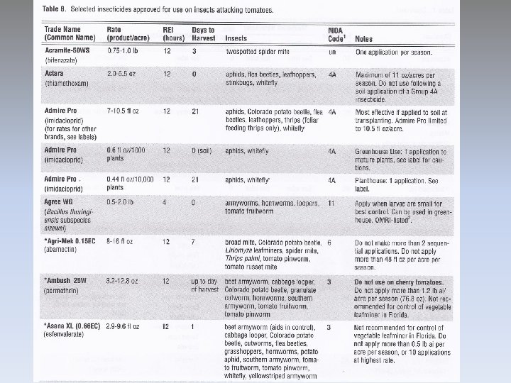 Tomato must be protected from TYLCV during first 5 weeks after transplanting Vegetative Whiteflies Mites Thrips Leafminers Armyworms Loopers Tomato hornworm Tomato pinworm Stinkbugs/leaf-footed bugs Flowering Green Fruit Ripe Fruit