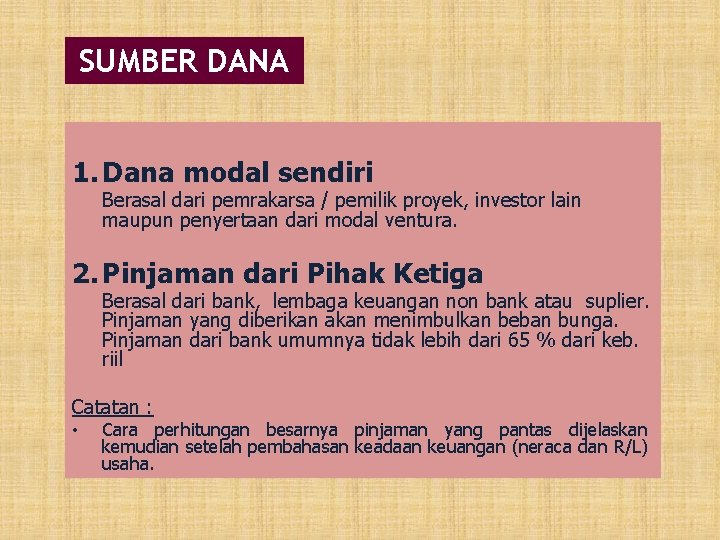 SUMBER DANA 1. Dana modal sendiri Berasal dari pemrakarsa / pemilik proyek, investor lain maupun penyertaan dari modal ventura. 2. Pinjaman dari Pihak Ketiga Berasal dari bank, lembaga keuangan non bank atau suplier. Pinjaman yang diberikan akan menimbulkan beban bunga. Pinjaman dari bank umumnya tidak lebih dari 65 % dari keb. riil Catatan : • Cara perhitungan besarnya pinjaman yang pantas dijelaskan kemudian setelah pembahasan keadaan keuangan (neraca dan R/L) usaha.