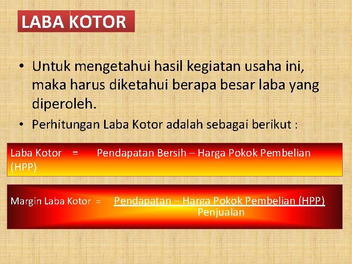 LABA KOTOR • Untuk mengetahui hasil kegiatan usaha ini, maka harus diketahui berapa besar laba yang diperoleh. • Perhitungan Laba Kotor adalah sebagai berikut : Laba Kotor = (HPP) Pendapatan Bersih – Harga Pokok Pembelian Margin Laba Kotor = Pendapatan – Harga Pokok Pembelian (HPP) Penjualan