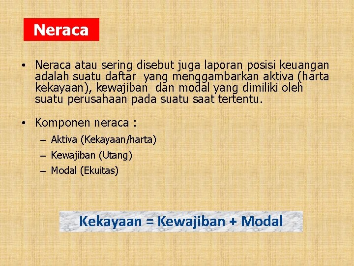 Neraca • Neraca atau sering disebut juga laporan posisi keuangan adalah suatu daftar yang menggambarkan aktiva (harta kekayaan), kewajiban dan modal yang dimiliki oleh suatu perusahaan pada suatu saat tertentu. • Komponen neraca : – Aktiva (Kekayaan/harta) – Kewajiban (Utang) – Modal (Ekuitas) Kekayaan = Kewajiban + Modal