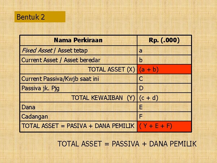 Bentuk 2 Nama Perkiraan Rp. (. 000) Fixed Asset / Asset tetap a Current Asset / Asset beredar b TOTAL ASSET (X) (a + b) Current Passiva/Kwjb saat ini C Passiva jk. Pjg D TOTAL KEWAJIBAN (Y) (c + d) Dana E Cadangan F TOTAL ASSET = PASIVA + DANA PEMILIK ( Y + E + F) TOTAL ASSET = PASSIVA + DANA PEMILIK