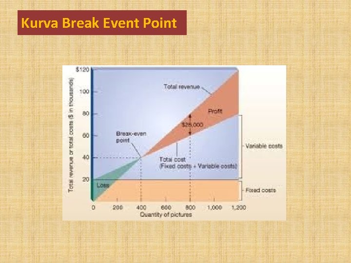 TITIK IMPAS (Break Even Point) Break event point digunakan untuk menutupi biaya variabel dan biaya tetap. • Rumus Break event point adalah sebagai berikut : BEP = Biaya Tetap Total (BTT) Harga x Biaya Variabel