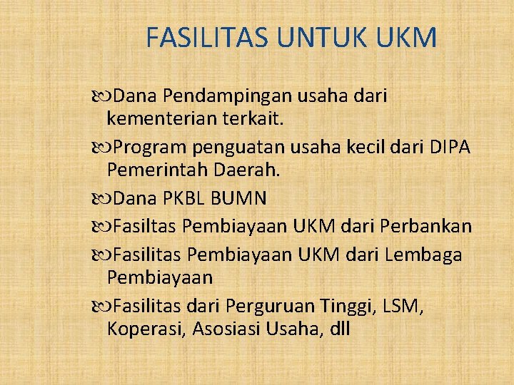 FASILITAS UNTUK UKM Dana Pendampingan usaha dari kementerian terkait. Program penguatan usaha kecil dari DIPA Pemerintah Daerah. Dana PKBL BUMN Fasiltas Pembiayaan UKM dari Perbankan Fasilitas Pembiayaan UKM dari Lembaga Pembiayaan Fasilitas dari Perguruan Tinggi, LSM, Koperasi, Asosiasi Usaha, dll