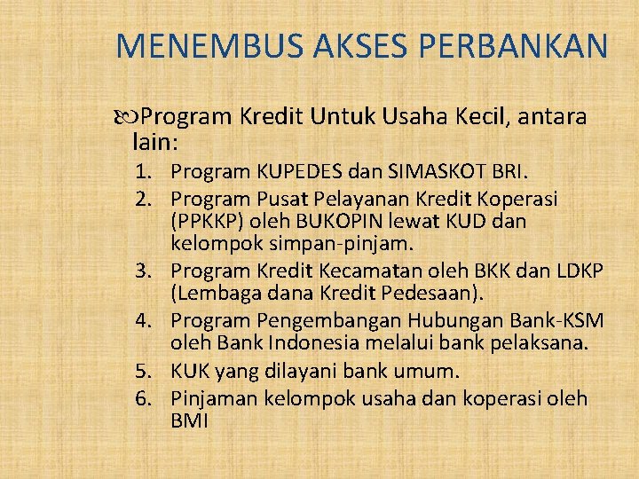 MENEMBUS AKSES PERBANKAN Program Kredit Untuk Usaha Kecil, antara lain: 1. Program KUPEDES dan SIMASKOT BRI. 2. Program Pusat Pelayanan Kredit Koperasi (PPKKP) oleh BUKOPIN lewat KUD dan kelompok simpan-pinjam. 3. Program Kredit Kecamatan oleh BKK dan LDKP (Lembaga dana Kredit Pedesaan). 4. Program Pengembangan Hubungan Bank-KSM oleh Bank Indonesia melalui bank pelaksana. 5. KUK yang dilayani bank umum. 6. Pinjaman kelompok usaha dan koperasi oleh BMI