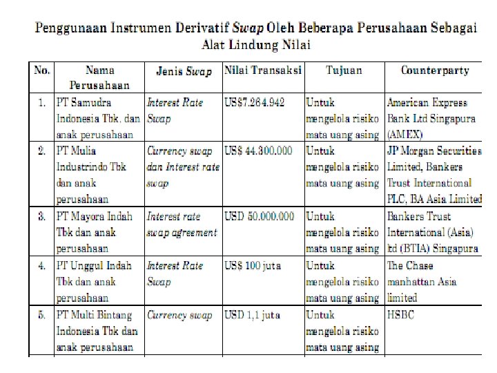 Contoh Instrument Derivatif • Kontrak forward (forward contracts), • Swap suku bunga dan mata uang (interest rate and currency swap), • Kontrak berjangka (future contracts), • Kontrak opsi (option contracts). .