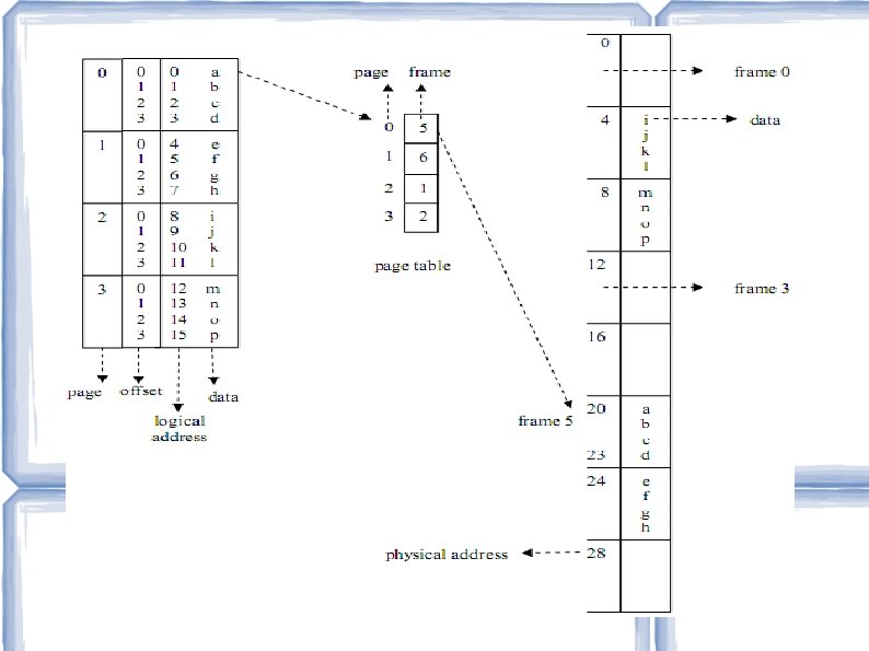 Contoh Misal setiap page berukuran 4 byte, memory berukuran 32 byte (yang dapat menampung 8 page). Alamat logik 0 memiliki nomor page 0 dan offset 0. Ketika dihubungkan dengan page table, maka diketahui bahwa page 0 terletak pada frame 5. Maka alamat logik 0 akan dipetakan ke alamat fisik 20 (yang diperoleh dari (5 x 4) + 0). Untuk alamat logik 3 (dengan page 0 offset 3) maka akan dipetakan ke alamat fisik 23 (=(5 x 4) +3). Untuk alamat logik 4 (dengan page 1 offset 0) maka akan dipetakan ke alamat fisik 24 (=(6 x 4) +0).