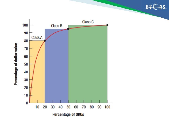 ABC Analysis A stock-keeping unit (SKU) item produk satuan yang telah diberi kode identitas dan disimpan dalam persediaan di dalam rantai pasok Ada ribuan SKU yang disimpan namun hanya sedikit bagian yang perlu diperhatikan secara seksama dan dikendalikan secara ketat ABC analysis proses membagi SKU menjadi 3 kelas sesuai dengan biaya yang dikeluarkan sehingga manajer dapat fokus pada item yang bernilai tinggi Tujuan ABC analysis mengidentifikasi SKU kelas A sehingga dapat dikontrol tingkat persediannya