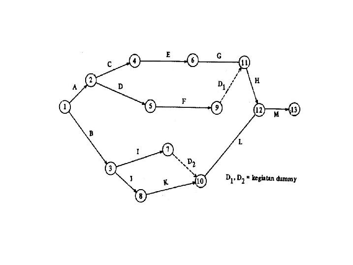 • Contoh pembuatan diagram anak panah 2 1. Gambarkan diagram anak panah yang mencakup kegiatan A, B, C, …. . , dan M sedemikian rupa sehinga hubungan berikut ini terpenuhi. 2. A dan B dapat dimulai secara serentak. 3. C dan D dapat dimulai kalau A sudah selesai. 4. E dapat dimulai kalau C sudah selesai. 5. G dapat dimulai kalau E sudah selesai. 6. F dapat dimulai kalau D sudah selesai. 7. H dapat dimulai kalau C, D, E, F dan G sudah selesai. 8. I dan J dapat dimulai kalau B sudah selesai. 9. K dapat dimulai kalau J sudah selesai. 10. L dapat dimulai kalau I, J, dan K sudah selesai. 11. M dapat dimulai kalau H dan L sudah selesai. 12. M kegiatan terminal.