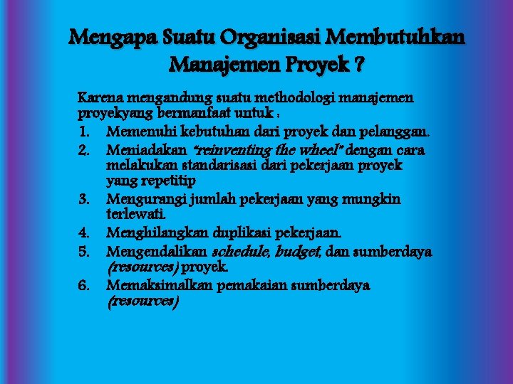 Mengapa Suatu Organisasi Membutuhkan Manajemen Proyek ? Karena mengandung suatu methodologi manajemen proyekyang bermanfaat untuk : 1. Memenuhi kebutuhan dari proyek dan pelanggan. 2. Meniadakan “reinventing the wheel” dengan cara melakukan standarisasi dari pekerjaan proyek yang repetitip 3. Mengurangi jumlah pekerjaan yang mungkin terlewati. 4. Menghilangkan duplikasi pekerjaan. 5. Mengendalikan schedule, budget, dan sumberdaya (resources) proyek. 6. Memaksimalkan pemakaian sumberdaya (resources)