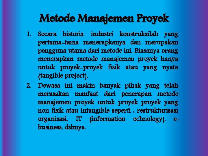 Metode Manajemen Proyek 1. Secara historis, industri konstruksilah yang pertama-tama menerapkanya dan merupakan pengguna utama dari metode ini. Biasanya orang menerapkan metode manajemen proyek hanya untuk proyek-proyek fisik atau yang nyata (tangible project). 2. Dewasa ini makin banyak pihak yang telah merasakan manfaat dari penerapan metode manajemen proyek untuk proyek yang non fisik atau intangible seperti : restrukturisasi organisasi, IT (information echnology), ebusiness, dsbnya.