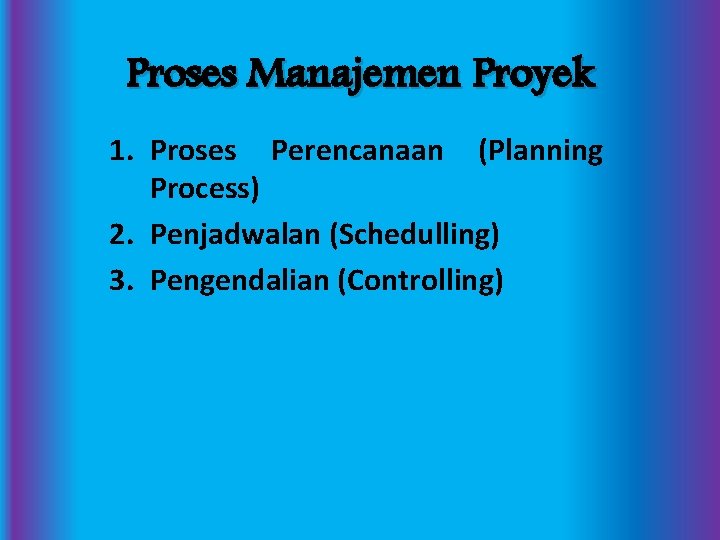 Proses Manajemen Proyek 1. Proses Perencanaan (Planning Process) 2. Penjadwalan (Schedulling) 3. Pengendalian (Controlling)