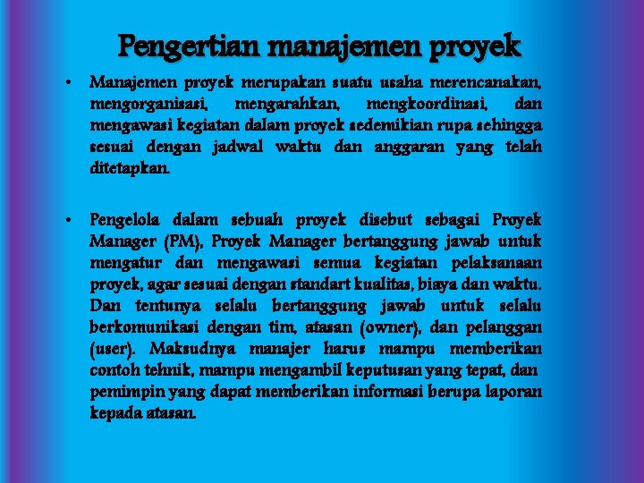 Pengertian manajemen proyek • Manajemen proyek merupakan suatu usaha merencanakan, mengorganisasi, mengarahkan, mengkoordinasi, dan mengawasi kegiatan dalam proyek sedemikian rupa sehingga sesuai dengan jadwal waktu dan anggaran yang telah ditetapkan. • Pengelola dalam sebuah proyek disebut sebagai Proyek Manager (PM), Proyek Manager bertanggung jawab untuk mengatur dan mengawasi semua kegiatan pelaksanaan proyek, agar sesuai dengan standart kualitas, biaya dan waktu. Dan tentunya selalu bertanggung jawab untuk selalu berkomunikasi dengan tim, atasan (owner), dan pelanggan (user). Maksudnya manajer harus mampu memberikan contoh tehnik, mampu mengambil keputusan yang tepat, dan pemimpin yang dapat memberikan informasi berupa laporan kepada atasan.