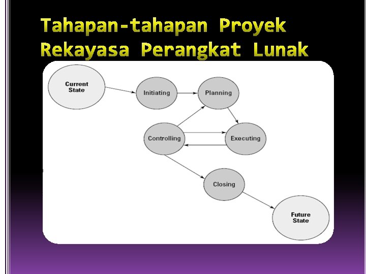 Initiating: proyek sedang dalam proses untuk dipilih/disetujui, disponsori, didanai, dan diluncurkan. Planning: perencanaan adalah proses yang berulang (perhatikan gambar). Perencanaan pada dasarnya menggambarkan proses bagaimana proyek akan dilaksanakan hingga selesai. Executing: setelah proyek direncanakan, tim proyek memulai pekerjaannya. Controlling: selama tim proyek mengerjakan tugasnya, project manager mengontrolnya. Closing: setelah proyek diselesaikan project manager akan menutup proyek software