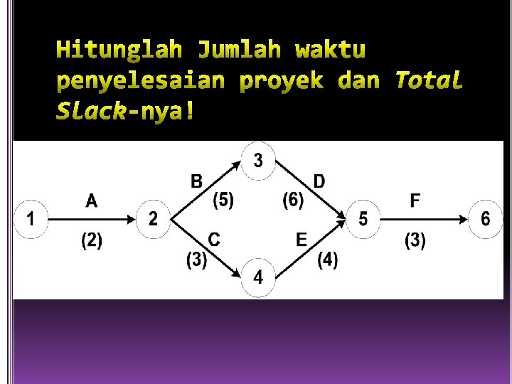 ES = Max {EF semua pendahulu langsung} EF = ES + Waktu kegiatan LF = Min {LS dari seluruh kegiatan yang langsung mengikutinya } LS = LF – Waktu kegiatan Slack adalah waktu yang dimiliki oleh sebuah kegiatan untuk bisa diundur, tanpa menyebabkan keterlambatan proyek keseluruhan Slack = LS – ES atau Slack = LF – EF