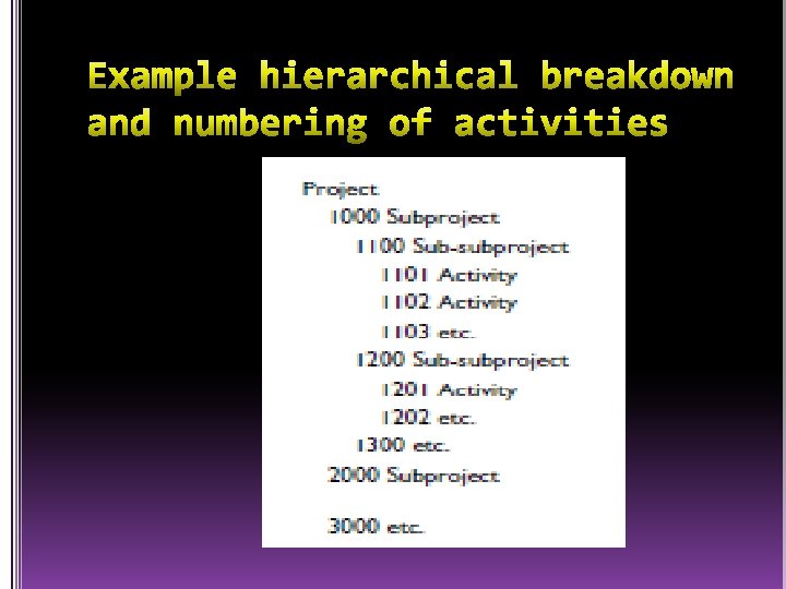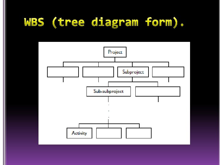 • Work Breakdown Structure, disingkat WBS, berisi daftar pekerjaan yang jika diselesaikan akan menghasilkan work product. WBS menyebutkan: Apa saja pekerjaan yang akan dilakukan, Tipe-tipe resource yang dibutuhkan untuk bekerja, Estimasi tiap elemen pekerjaan, Identifikasi lokasi penyimpanan. Tetapi tidak mencantumkan: Siapa yang mengerjakan pekerjaan-pekerjaan itu, Dan kapan pekerjaan itu akan diselesaikan