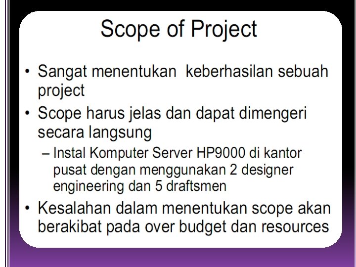Proyek adalah pengkoordinasikan segala sesuatu hal dengan menggunakan perpaduan sumber daya manusia , teknik, administratif, keuangan untuk mencapai tujuan yang jelas dan dalam periode waktu tertentu Proyek bukan sesuatu pekerjaan yang rutin Memiliki sasaran dan tujuan yang jelas. Memiliki batasan (ruang lingkup, waktu dan anggaran).