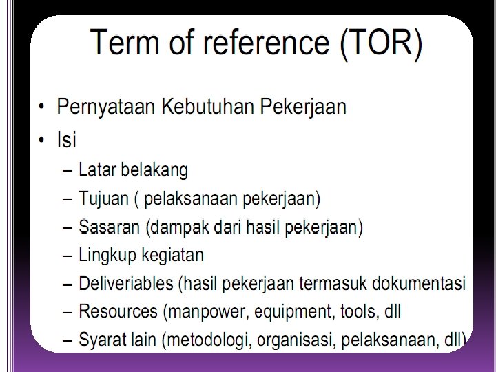 l Konteks bagaimana PL yang dibangun dapat memenuhi sebuah sistem, produk, atau konteks bisnis yang besar, serta batasan apa yang ditentukan sebagai hasil dari konteks tersebut? l Tujuan Informasi Objek data pelanggan apa yang dihasilkan sebagai output dari perangkat lunak? l Fungsi apa yang dilakukan oleh PL untuk mentransformasi input data menjadi output?