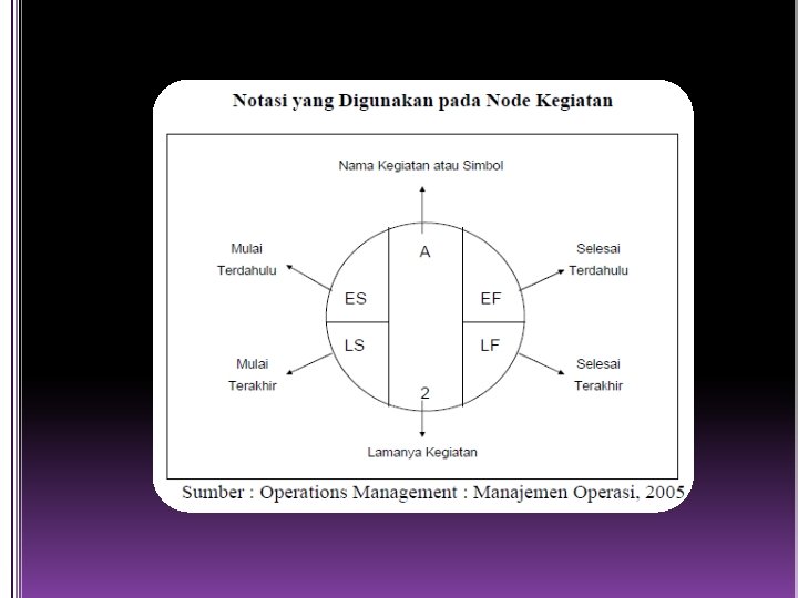 ES (earliest start) adalah waktu terdahulu suatu kegiatan dapat dimulai, dengan asumsi semua pendahulu sudah selesai EF (earliest finish) merupakan waktu terdahulu suatu kegiatan dapat selesai LS (latest start) adalah waktu terakhir suatu kegiatan dapat dimulai sehingga tidak menunda waktu penyelesaian keseluruhan proyek LF (latest finish) adalah waktu terakhir suatu kegiatan dapat selesai sehingga tidak menunda waktu penyelesaian keseluruhan proyek.