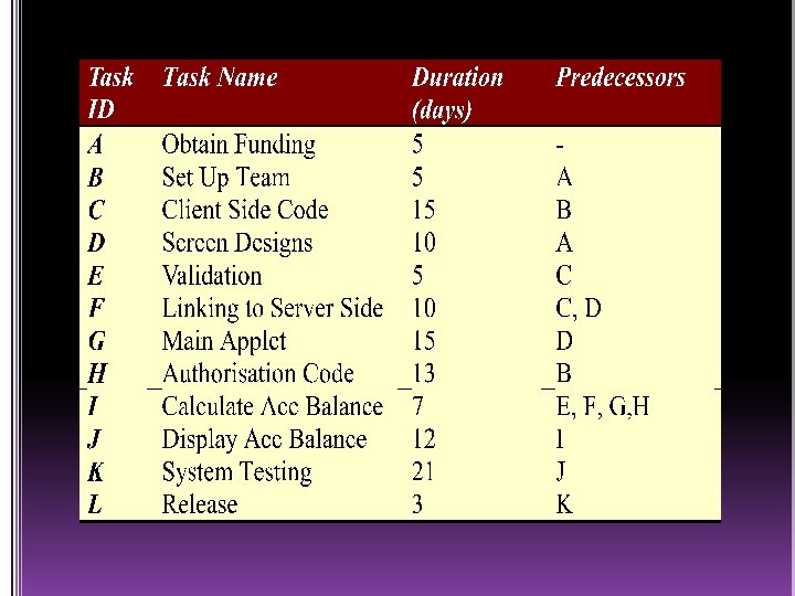 10 13 23 ES D EF 5 Start LS F 0 0 LF 0 Start 0 0 5 5 10 H 3 E L B 0 5 10 15 25 10 C F 21 K 5 15 A G 0 EF=ES+D ES is the latest EF of a tasks predecessors 5 10 15 7 12 D I J