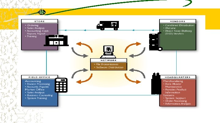 Information Strategy Customer checkout process – Pegawai mencatat jenis kelamin, umur dan item pembelian. Data Point of Sales (POS) dikirim ke database dikantor pusat – Toko Hardware: Toko komputer, POS meregistrasi hubungan dengan toko komputer, Graphic Order Terminals, Scanner terminals untuk penerimaan Daily use of the data – Kantor Pusat akan mengolah data berdasarkan area, produuk, waktu, supllier dan toko pada keesokan harinya Manager toko akan membuat informasi trend. Weekly use of the data – Senin pagi , CEO mengadakan pertemuan untuk memformulasikan strategi mingguan. – Selasa pagi, strategi dikomunikasikan kepada seluruh manager operasi strategies Akses cepat untuk up to date informasi: Implementasi Integrated Service Digital Network untuk menghubungkan toko (stores), kantor pusat dan pemasok