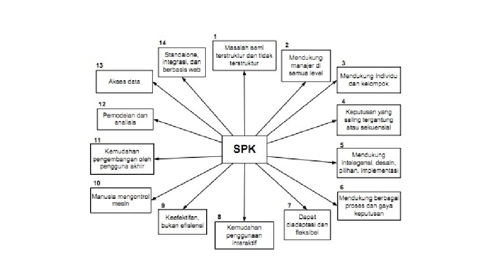 6. Dukungan pada berbagai proses dan gaya pengambilan keputusan. 7. Kemampuan sistem beradaptasi dengan cepat dimana pengambil keputusan dapat menghadapi masalah-masalah baru dan pada saat yang sama dapat menanganinya dengan cara mengadaptasikan sistem terhadap kondisi-kondisi perubahan yang terjadi. 8. Pengguna merasa seperti di rumah. User-friendly, kapabilitas grafis yang kuat, dan sebuah bahasa interaktif yang alami. 9. Peningkatan terhadap keefektifan pengambilan keputusan (akurasi, timelines, kualitas) dari pada efisiensi (biaya). 10. Pengambil keputusan mengontrol penuh semua langkah proses pengambilan keputusan dalam memecahkan masalah. 11. Pengguna akhir dapat mengembangkan dan memodifikasi sistem sederhana. 12. Menggunakan model-model dalam penganalisisan situasi pengambilan