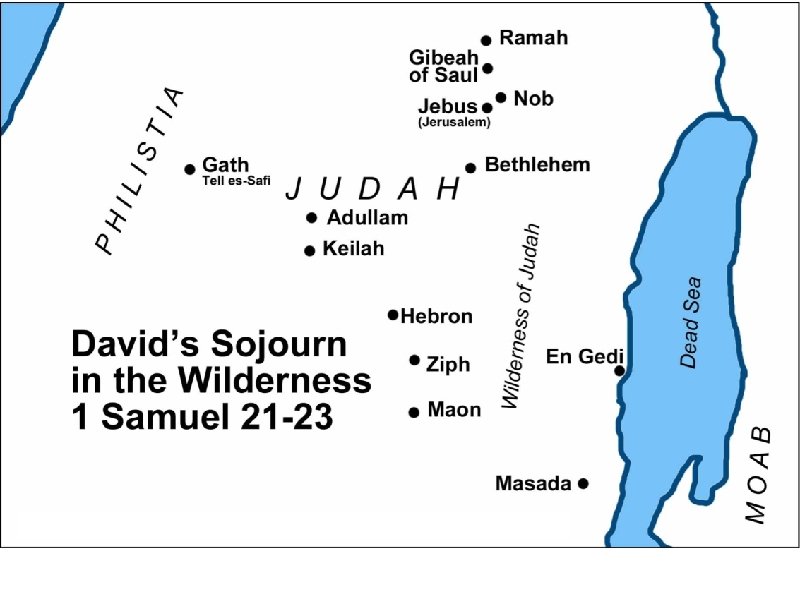 1. Ahimelech gives David consecrated bread 21: 1 -6 - David came to Nob from Gibeah - Nob - to be high - priestly city, N of Jerusalem - Ahimelech - high priest - father of Abiathar - Trouble with Saul seems to be known - David alone - priest afraid - He did not know Saul was seeking to kill David - Secret mission - going to unspecific place - Flee for his life - a lie - weakness - Mitigated by war & strategy - Some suggest a mission was give before he fled - Did have men he was meeting Matt. 12: 3, 4