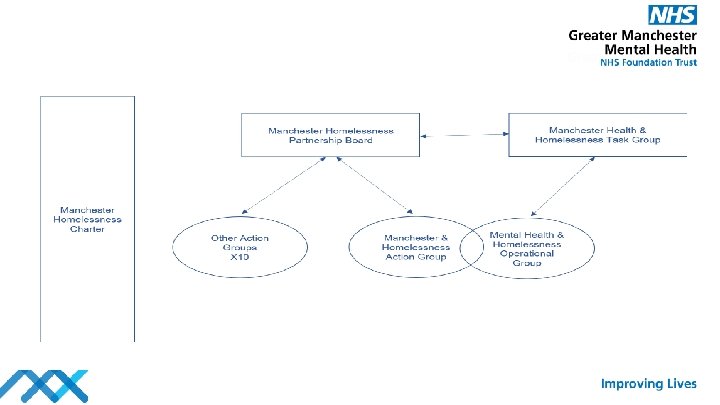 Organisations involved GMMH Booth Centre Urban Village Inspiring Change Manchester Riverside Manchester City Council Turning Point Men’s Room Self Help services Mustard Tree MFT (NHS) Big Life Cornerstones CGL Barnabus On the out