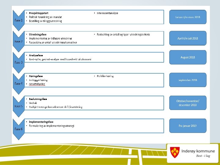 Forankring/utforming av mandat • Gjennomført dialog med representanter fra FAU Mosvik, Utøy og Lyngstad • Gjennomgang på enhetsledermøte • Gjennomgang på HTV-forum • Gjennomgang med rektor-/styrerkollegiet • Orientering i Folk/formannskapet i februar • Møte med ansatte skole/bhg. Mosvik, Utøy, Lyngstad • Realitetsbehandling av mandatet i formannskapet i mars