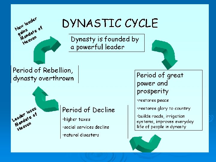 Dynastic Cycle ØA strong leader emerges and establishes a new dynasty ØClaims mandate ØCycle begins again