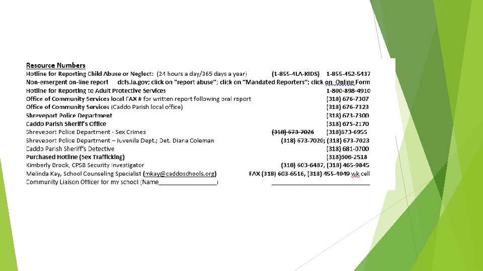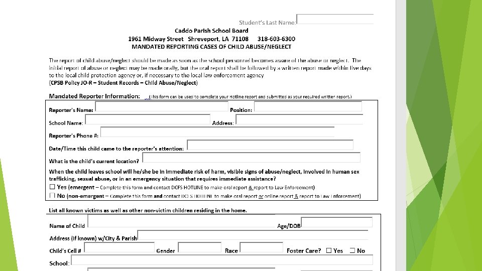 Caddo’s Reporting Form CPSB’s reporting form § Revised 8/01/2019 - FILLABLE § Use Caddo form to make oral and written report § Is aligned with Louisiana Law and CPSB Policy § Is more detailed than the state reporting form § Follows the questions asked by the child protection intake worker § Documents reporting procedures § Includes reminders and resource numbers A report is a request for an investigation, not an accusation.