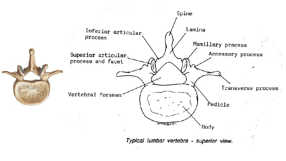 General features of the typical lumbar vertebrae (L 1 -L 4) 1 - A large body which increases in size gradually from the 1 st to the 4 th. 2 - A wide triangular vertebral foramen. 3 - A thin (long and tapering) transverse process. 4 An accessory process behind the root of the transverse process. 5 - The superior articular process is curved with the superior articular facet concave medially. 6 - The inferior articular process is curved with the inferior articular facet convex laterally. - The distance between two superior articular processes (facets) is wider than the inferior. 7 - Mammillary process on posterior edge of superior articular process. 8 - Spine is broad and quadrilateral,