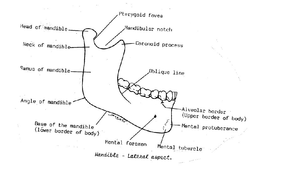 External surface of body of mandible Has 2 borders and 2 surfaces Oblique line Horse-shoe shaped body Symphysis menti mental protuberance alveolar border Mental foramen base of mandible