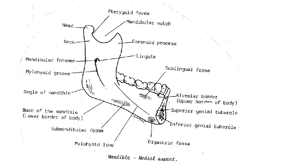 • Body of the mandible - It is horse-shoe shaped havening; - 2 borders (upper and lower) - 2 surfaces (inner and outer) A- Upper border (alveolar margin), carries the sockets for the teeth. B- Lower border shows digastric fossa close to the symphysis menti on each side. C- Outer surface; shows the following features. 1 - Symphysis ﺍﻻﻟﺘﺼﺎﻕ menti; a faint median ridge. 2 - Mental ﺫﻗﻨﻲ protuberance; a median elevation in front of body close to lower border. 3 - Mental tubercle, a projection on each side of the mental protuberance. 4 - Mental ﺫﻗﻨﻲ foramen; on the outer surface transmits the mental nerve and vessels. 5 - Oblique line; from the anterior border of the ramus to the mental foramen. D- Inner surface. 1 - Superior and inferior genial ﺫﻗﻨﻲ tubercles; close to the middle line. 2 - Mylohyoid line, an oblique Line on the inner surface of the body. 3 - Submandibular fossa, below the mylohyoid line to submandibular gland. 4 - Sublingual fossa, above the mylobyoid line to sublingual gland.