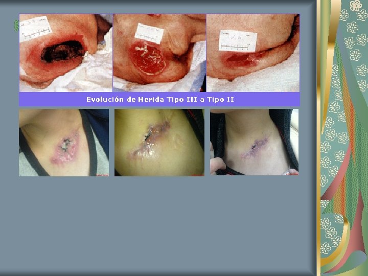 Compromiso del tejido: Sin perdida de epidermis. Pérdida parcial de epidermis y/o dermis. Pérdida téjido subcutáneo hasta fascia. Pérdidad total de la piel con exposicón de estructura interna. Calidad del exudado que produce la herida, ya secreción: serosa turbia purulenta Edema: Medido a través de la presión dactilar: Edema + : < 0, 3 cm Edema ++ : 0, 3 - 0, 5 cm. Edema +++: > 0, 5 cm.