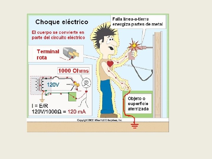 MANEJO DE HERRAMIENTAS ELÉCTRICAS RIESGOS DEL CUERPO La resistencia de la piel tiende a aumentar su capacidad dieléctrica cuando se encuentra seca y es de gran espesor; por el contrario, es baja cuando la piel esta húmeda y es fina. La resistencia de la piel es superior a la que ofrecen los órganos internos del cuerpo que depende de las propiedades de los tejidos, músculos, nervios, vasos sanguíneos. Se tienen diversas experiencias que han permitido calcular la resistencia de la piel por cm 2, observándose que varía notablemente; por ejemplo: Para piel húmeda y fina la resistencia es de 100 a 500 ohmios en corrientes alternas y de unos 1800 ohmios en continua. Para la piel seca y rugosa, la resistencia varía de 100. 000 a 600. 000 ohmios alcanzando hasta 1. 000 ohmios. La resistencia interna promedio del cuerpo aproximadamente es de 500 Ohms.