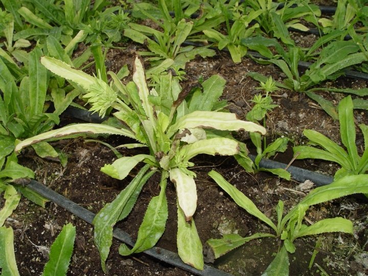Marchitez por Fusarium oxysporum f. sp. basilicum • Las plantas desarrollan amarillez parcial o general. • El tejido afectado se observa oscuro y acuoso. • Hay decoloración de los haces vasculares. • Este hongo se encuentra en la semilla y persiste en el suelo por largos periodos una vez se establece.