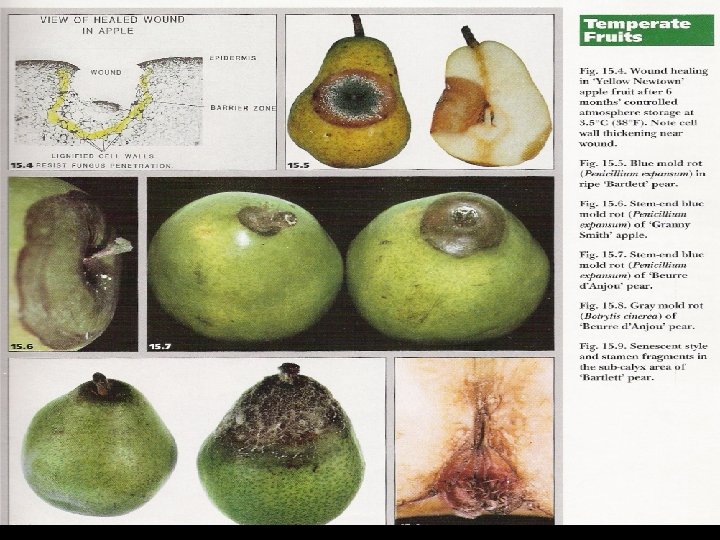 ESCALDADO POR ALMACENAMIENTO • En las manzanas este desorden fisiológico es más severo en frutos algo inmaduros, sin embargo, este desorden aparece en peras independientemente de su estado de madurez. Aparecen parches cafés en la superficie de los frutos, los cuales pueden no desarrollarse hasta que se calientan los frutos posteriormente a su almacenamiento. El uso de atmósferas modificadas y el enfriamiento completo así como el mantenimiento de los frutos a bajas temperaturas puede ayudar a controlar este desorden fisiológico.