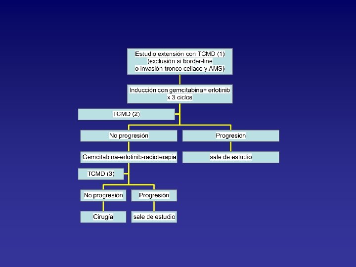 Estadificación CT toraco-abdominal (MD), USE+PAAF, PET-TC CA 19. 9 (MT) Brazo A CIRUGíA (n. cortes >12) margenes posterior, vascular (SMV), medial Brazo B ESTUDIO (GEM + ERLO x 3 meses seguido de GEM-ERLO-RDT) CIRUGIA R 1 >60% GEM +ERLO x 3 meses seguido de GEM-ERLO-RDT R 1<30%