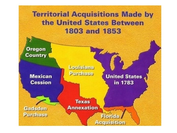 Lands Acquired Between 1783 -1853 �Oregon Country (1846)-Gained from Great Britain in a compromise that continued the northern border set at the 49 th parallel �Mexican Cession (1848)-Became part of the U. S. by the Treaty of Guadalupe Hidalgo ending the Mexican American War (1846 -1848). The War was fought over the disputed land between the U. S. and Mexico and James K. Polk’s expansionist policies. �Gadsden Purchase (1853)-Purchased from