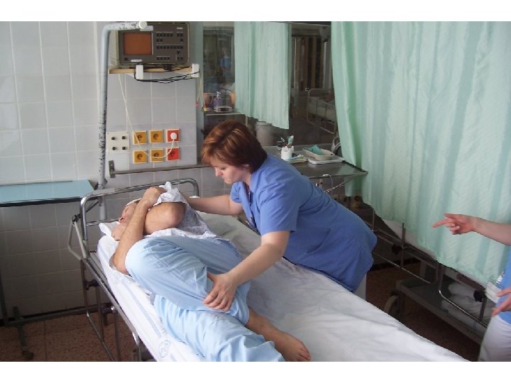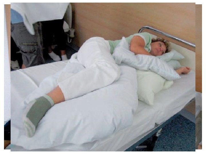Otáčení pacienta na lůžku • Před jakoukoliv změnou polohy zhodnotit stav pacienta • Upravit si výšku lůžka • Odstranit pomůcky z lůžka • Zajistit pacienta proti pádu • Otáčíme směrem k sobě • Lépe pracovat ve dvou osobách • Vhodné vložit polštář mezi kolena • Nejdříve posunout k opačné straně a pak otočit