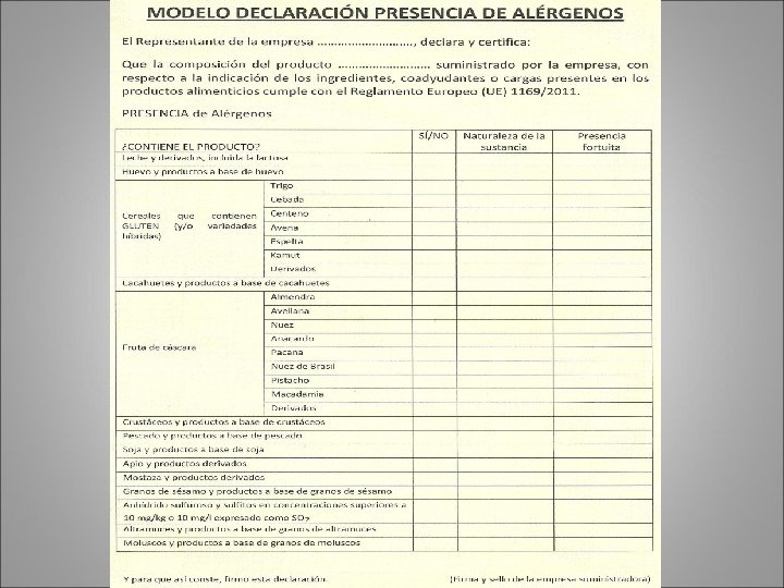 Control de alérgenos en proveedores ü Solicitar al proveedor Declaración de Presencia o Ausencia de Alérgenos de cada una de las materias provistas. ü Se puede dar el caso de que un mismo ingrediente se adquiera a proveedores diferentes, pidiendo la declaración en este caso a los dos. ü Establecer sistema de auditoría u homologación de proveedores.