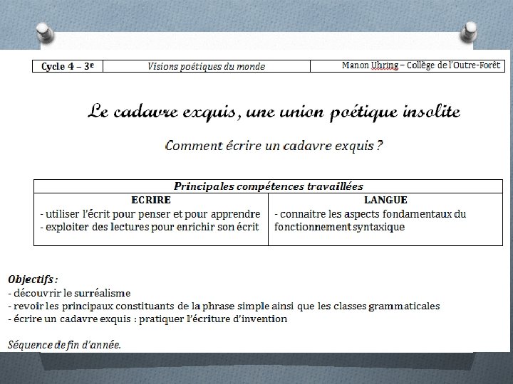 Utiliser la langue pour écrire – exemple 3 Rappel des fonctions pour écrire des cadavres exquis - 3 e - A consulter également : proposition de séquence de Valentin Rietz – collège Stockfeld (diaporama sur l’étude de la langue)