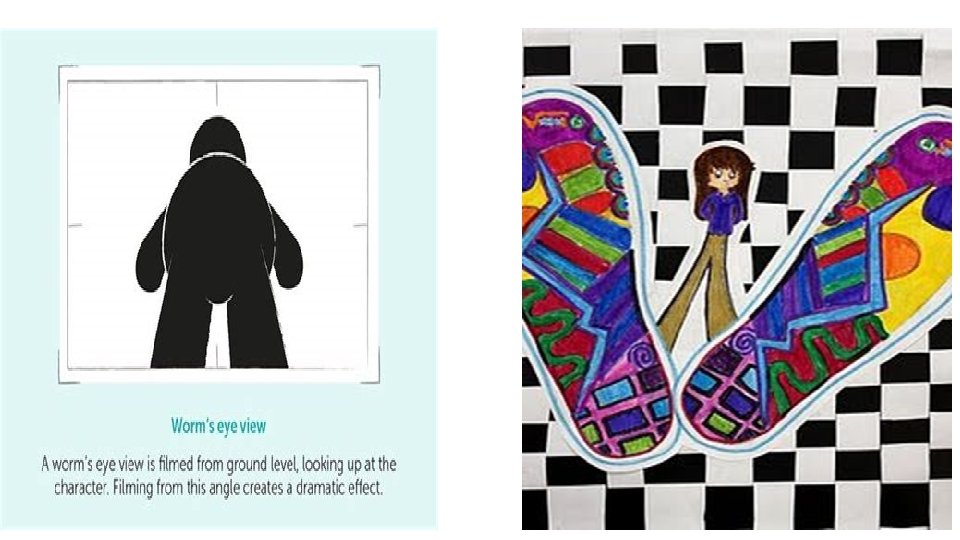 What is a point of view? • Writers tell a story from a certain person's point of view: • 1 st person- Uses “I”, one character’s point of view • 2 nd person- Uses “you and or yours” to constantly address the other person • 3 rd person- Uses “he, she, or they; ” for a narration • An Artists also create points of view through visual art. There are 3 views that artists choose from: • Eye level view: Looking straight at an object (point out) • Worms eye view: Looking up at an object. (point up) • Birds eye view: from above the object (point down)