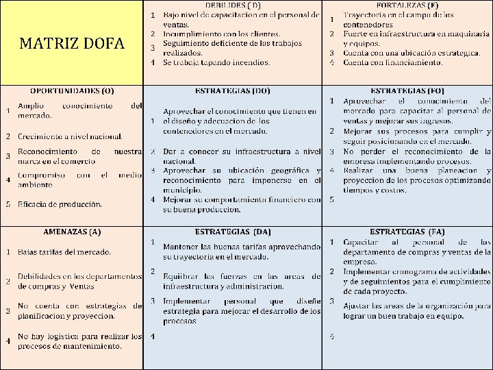 Matriz DOFA �Es una matriz que permite enfocarse en los factores claves de la empresa. Debilidades y Fortalezas: Están relacionadas con las partes de la empresa en las cuales se tiene que tener control, se tienen en cuenta: Equipos, edificios, sistemas, Productos, Recursos y Servicios. Oportunidades y Amenazas: Están relacionadas con el entorno de la empresa y tienen lugar en el mundo externo, son influenciables pero no controlables, se tienen en cuenta: Análisis del entorno, proveedores, canales de distribución, clientes, mercados, competidores, etc.