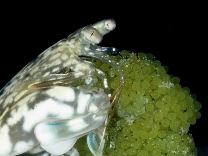 In monogamous Lysiosquillids such as these 31 cm L. maculata, males have larger raptorial appendages and eyes and do most of the hunting, provisioning their mates.