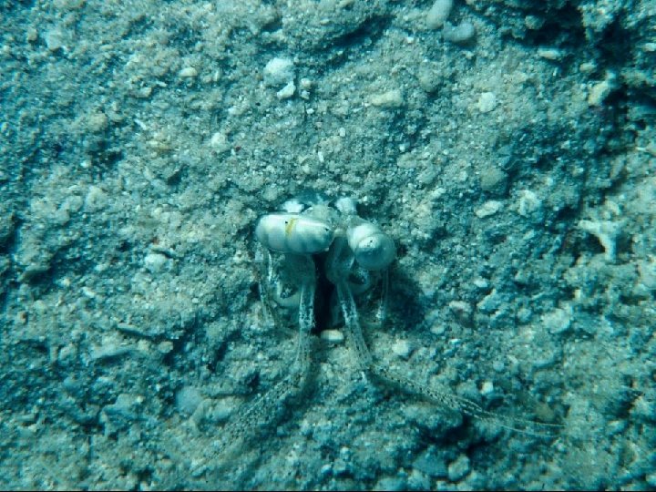 One of the smallest of all stomatopods, Pullosquilla doesn’t fit our hypothesis as to why it is monogamous. Males are highly mobile and can dig a new burrow in minutes. They also occur at high density so the cost of searching must be low.